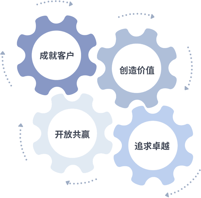 成就客户是一切决策的出发点,,,创造价值是衡量所有工作的标准,,,,追求卓越是我们做事做人的态度,,,开放共赢是我们的格局也是最终的结果。。。价值观的齿轮环环相扣,,推动着组织里的每个人不断向前。。。